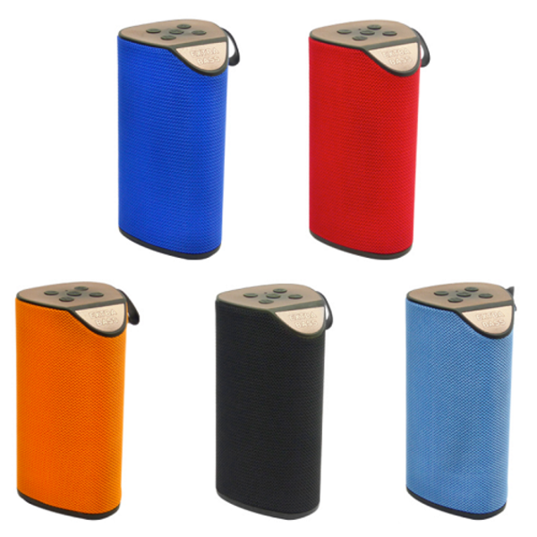 - Bocina bluetooth forrada en tela, con base de goma, entradas USB, SD, recepción radio FM, con agarradera de goma, excelente calidad de audio